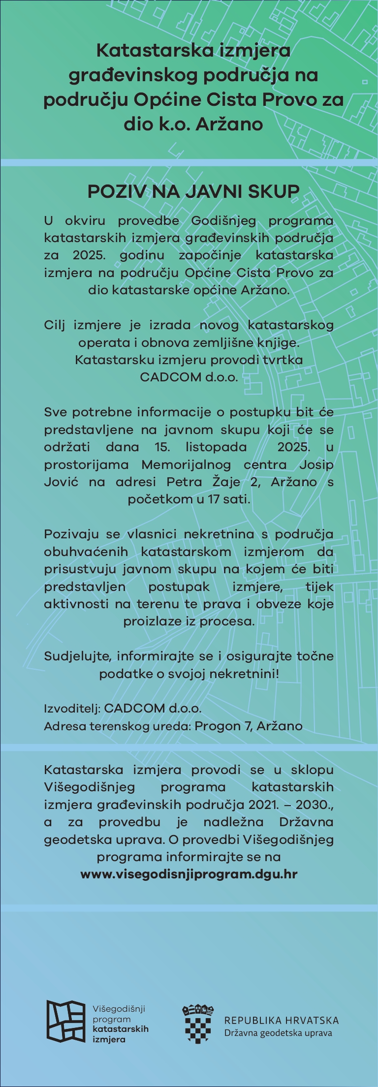Katastarska izmjera za dio k.o. Aržano – Poziv na javni skup lis 9, 2025 Pregledna karta područja obuhvaćenog katastarskom izmjerom na području Općine Cista Provo za dio K.O. Aržano